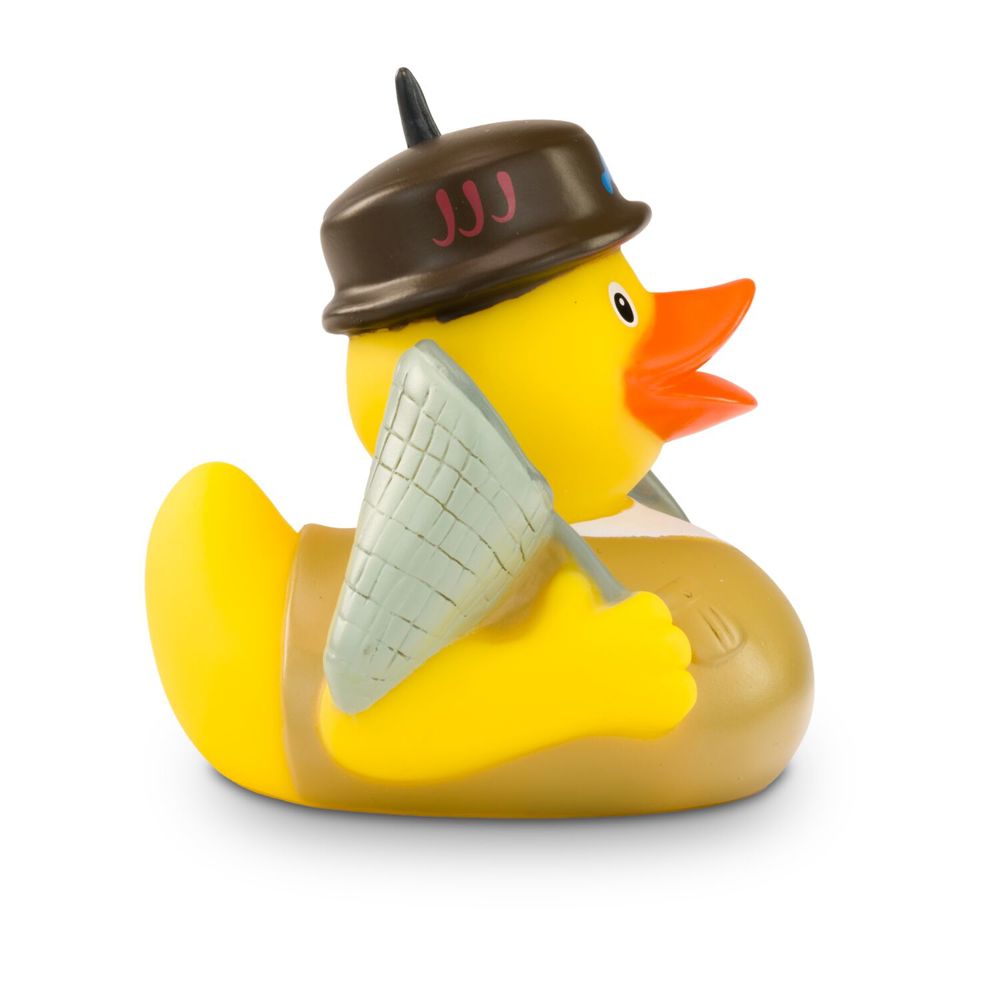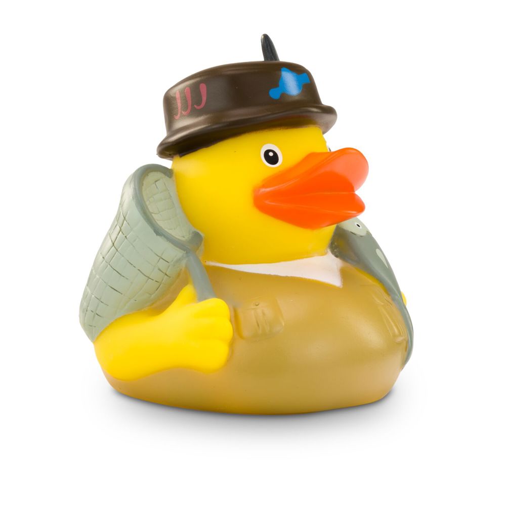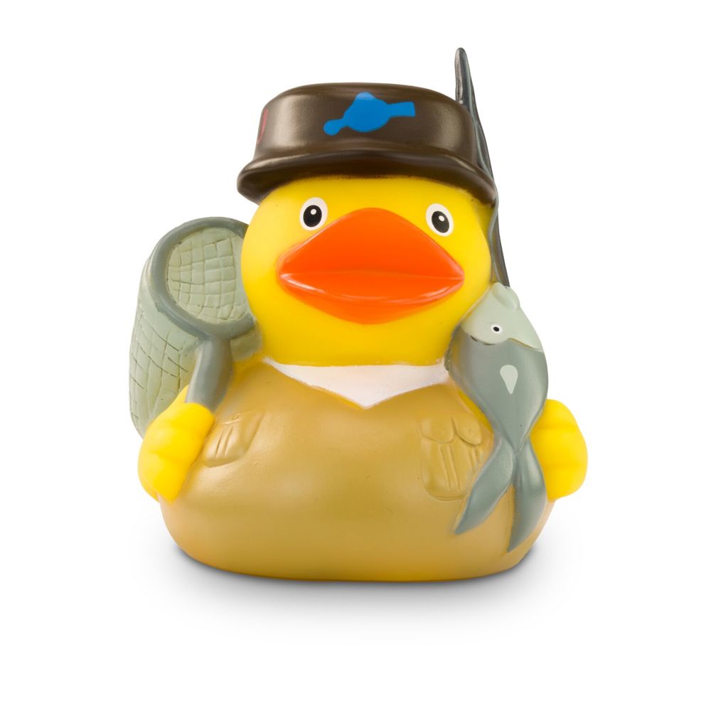 The Petri Heil duck is a talented angler. He loves fishing and wears a traditional fishing hat on his head and a brown outdoor shirt. She even has a fish on the line. Under her other wing, she is holding a catcher ready and waiting patiently for the right moment. Size: approx. 8 cm. Squeak valve included