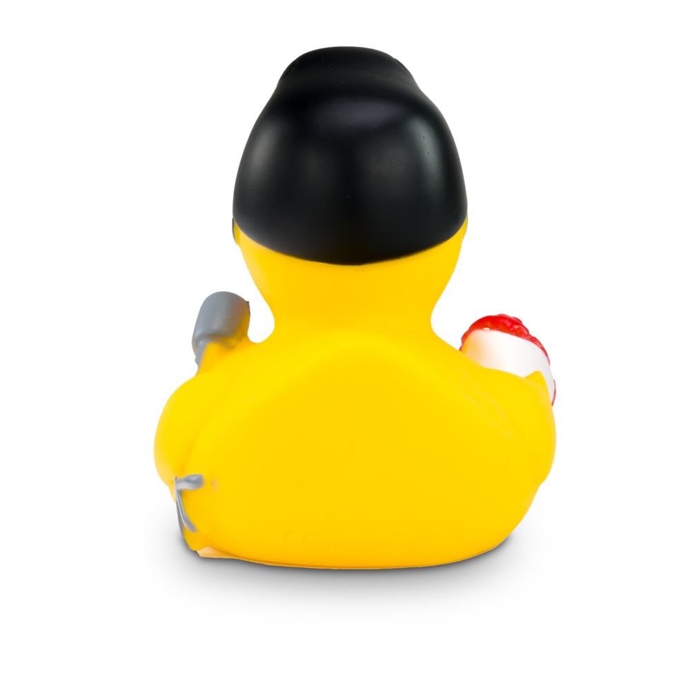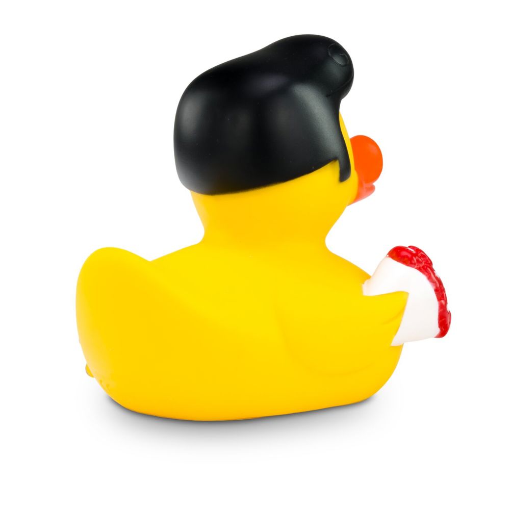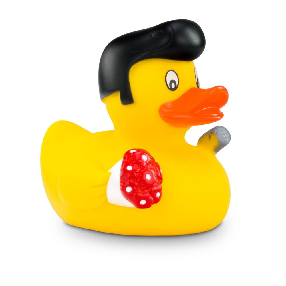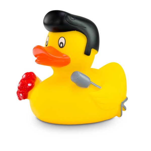 The rocking squeaky duck with cult factor. With a striking black quiff, red roses in his left wing and a light gray microphone in his right hand, Rocky Roll is the star of every bathtub. Perfect for music fans, rock'n'roll lovers or as an unusual gift with retro charm. He competes with the King of Rock and Roll. Size: approx. 8 cm. Squeak valve included
