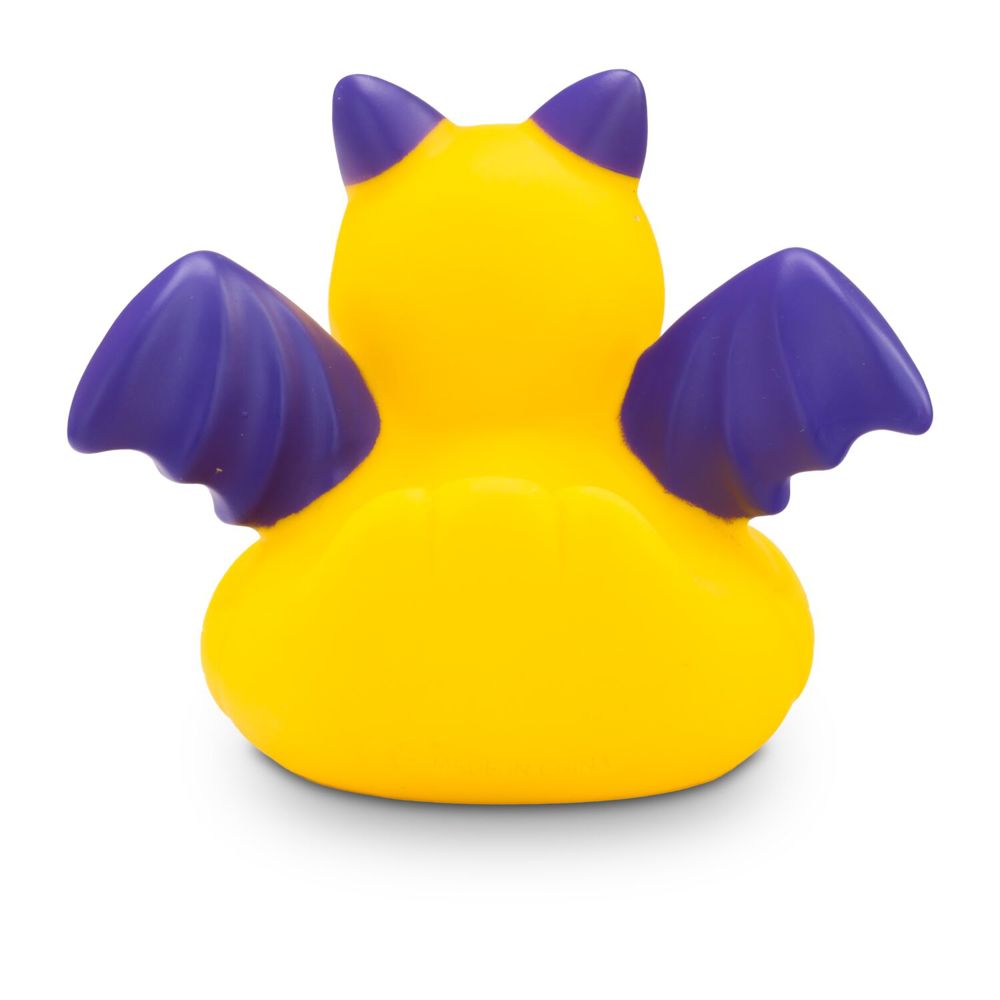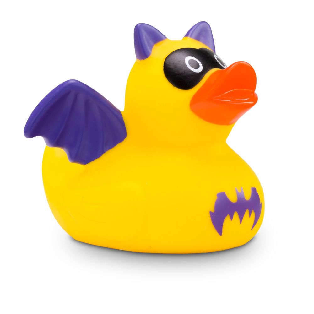 Batduck, the superhero squeaky duck for all comic fans in a yellow and purple bat look: With a black eye mask, purple wings, pointed ears and purple bat logo on the chest, this rubber duck is ready for great heroic deeds in the bathtub. Size: approx. 8 cm. Including squeak valve