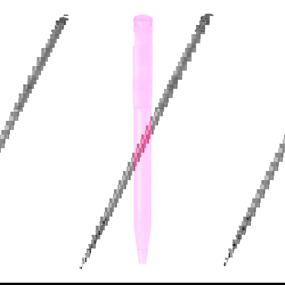 Modern transparent S45 Clear ball pen with bow clip. With a big imprint space, it is a nice advertising item. It includes a pusher mechanism and a X20 refill with blue writing ink. The pen is made of ABS and is made in Europe. From orders of 5.000 pieces, you can choose your own colour combination.