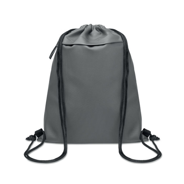 Drawstring bag with PU coated 600D RPET polyester and 190T RPET polyester lining. Zippered front pocket.