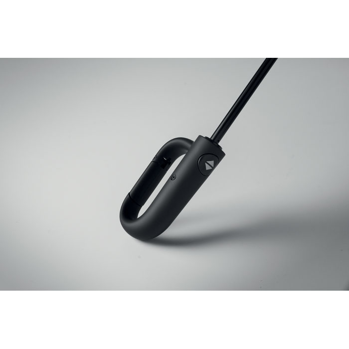 Foldable 21'' windproof umbrella with full black plating fibreglass frame with 2 sections. Fibreglass ribs. 190T RPET pongee panels. D shape carabiner handle w/ rubber finish. Auto open and closure. Includes pouch
