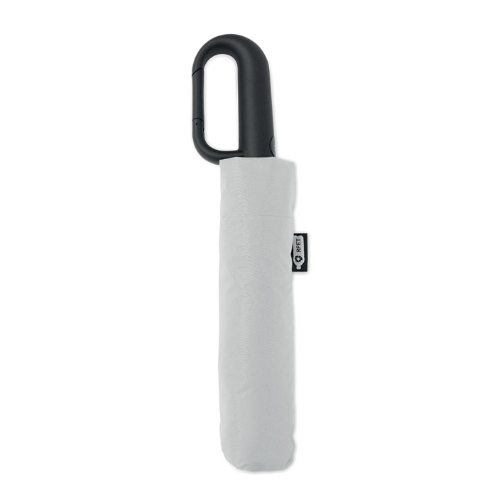 Foldable 21'' windproof umbrella with full black plating fibreglass frame with 2 sections. Fibreglass ribs. 190T RPET pongee panels. D shape carabiner handle w/ rubber finish. Auto open and closure. Includes pouch
