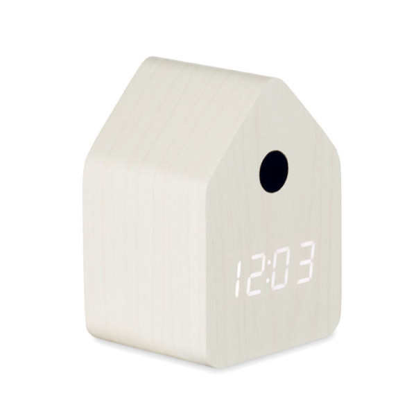 Small MDF desk clock including a built-in alarm with bird cuckoo voice and temperature display. Bird cuckoo voice every full hour and during alarm. White LED display. Sound is automatically silenced between 22.00h to 06.00h. 5 mins snooze intervals