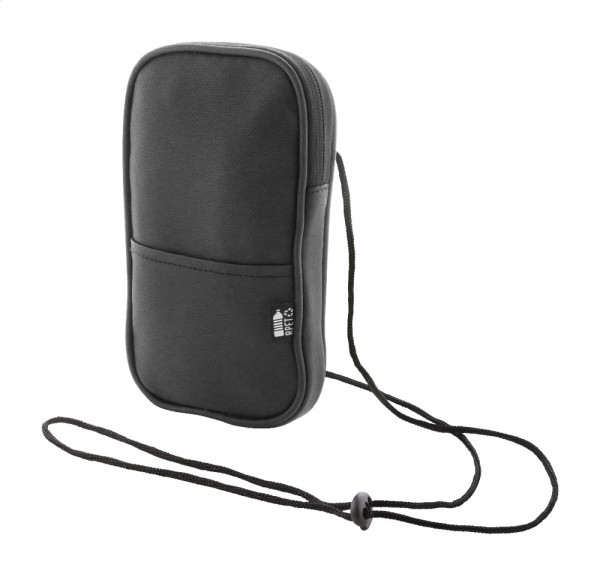 Waterproof RPET crossbody mobile phone bag with zipped main compartment, front pocket and adjustable lanyard. PU coated 600D RPET polyester, with distinctive RPET label.
