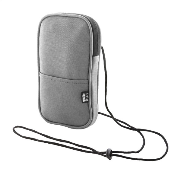 Waterproof RPET crossbody mobile phone bag with zipped main compartment, front pocket and adjustable lanyard. PU coated 600D RPET polyester, with distinctive RPET label.