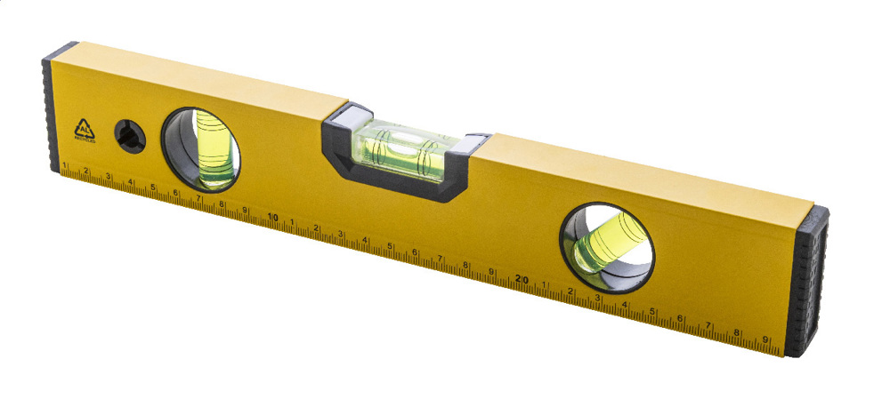 Magnetic spirit level in recycled aluminium with triple spirit levels (horizontal, vertical, and 45°) and 30 cm ruler.