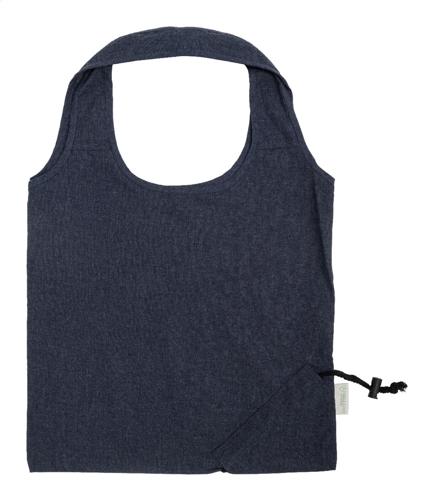 Foldable shopping bag in 70% recycled cotton and 30% RPET polyester, 140 g/m². With distinctive recycled cotton label.