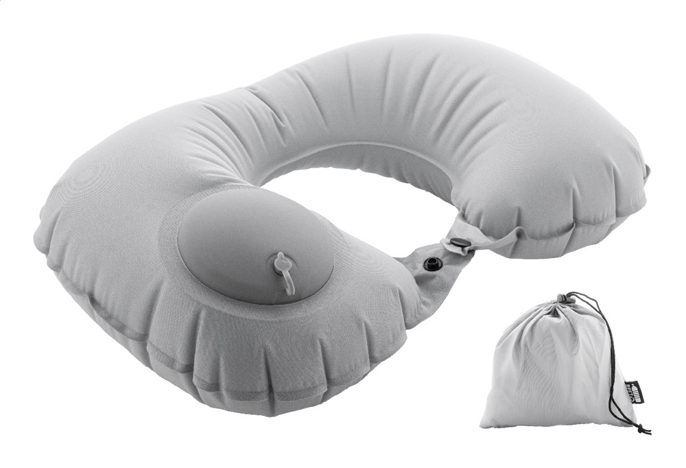 Inflatable RPET polyester travel pillow with built-in pump for easy inflation and deflation. In matching fabric drawstring pouch. With distinctive RPET label.