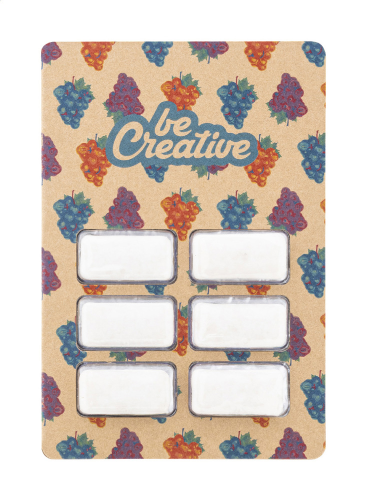 6 pcs sugar free chewing gum in blister with custom made, full colour printed perforated kraft paper sleeve. MOQ: 100 pcs.