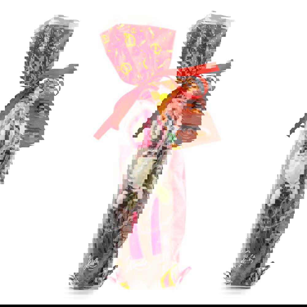 Hollow milk chocolate Sinterklaas figure (approx. 125 grams) in a colourfully printed classic cellophane gift bag. Comes with a double-sided full colour printed tag.