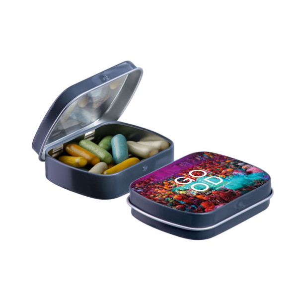 Mini white hinge tin with approx. 23 grams of Mini Choco's, printed in full color. Includes... more