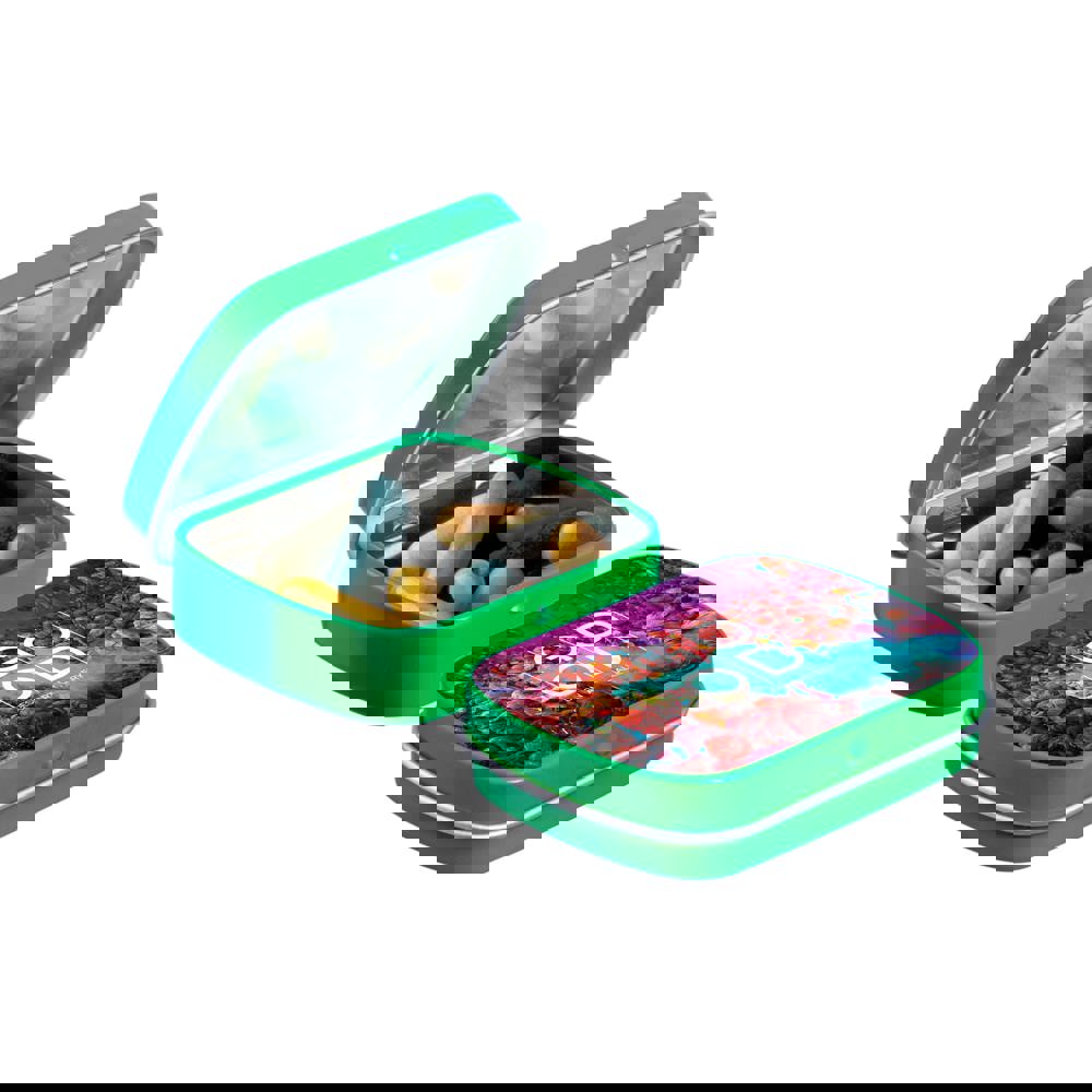 Mini white hinge tin with approx. 23 grams of Mini Choco's, printed in full color. Includes ingredient sticker and seal.