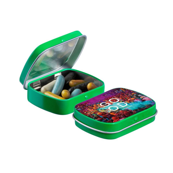 Mini white hinge tin with approx. 23 grams of Mini Choco's, printed in full color. Includes... more