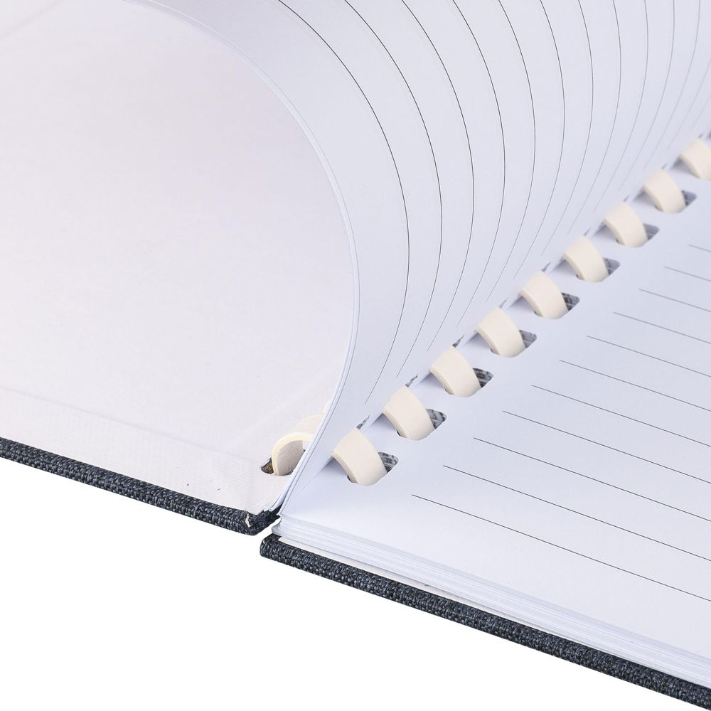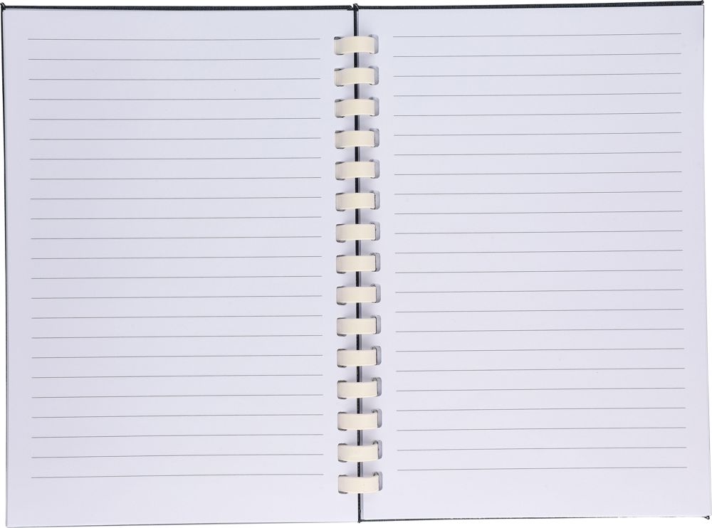 rPET notebook (approx. A5) with a hard cover and elastic closing band. Features a white cardboard spiral (15-ring), ribbon bookmark, and 80 sheets (70 gsm) with lined paper. Includes an rPET logo on the back. Wrapped in tissue paper, no polybag.