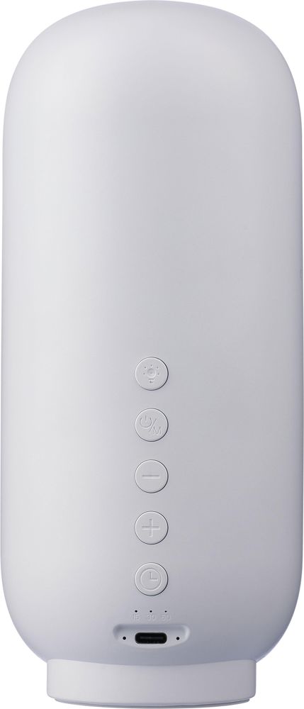 Recycled ABS and rPET fabric 3-in-1 speaker with light function and sleep therapy. Features a 3W speaker, wireless technology (version 5.3), and a 1,200 mAh Li-ion battery. Equipped with four warm LED lights and six soothing sleep sounds: Stream, Brahms’ Lullaby, Sea Wave, Silent Night, Fetal, and White Noise. Offers three brightness levels and a timer with 15, 30, and 60-minute settings. Easily switch between wireless and white noise modes using the five-button control panel on the back. Includes a 1-meter white charging cable. Individually packaged in a kraft paper box.