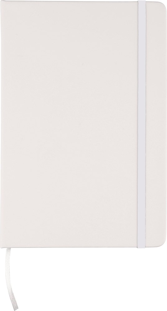 rPET notebook (approx. A5) with a hard cover made of rPET PU, containing 80 lined pages (70 gsm). Features an elastic band and ribbon in a matching color. Includes an embossed recycled logo on the backside.