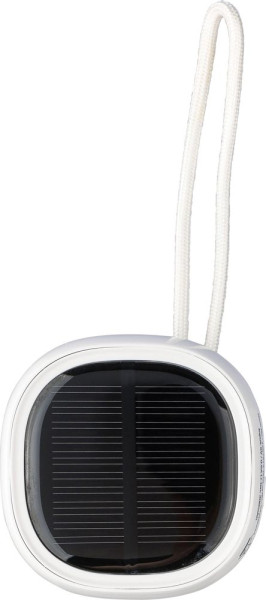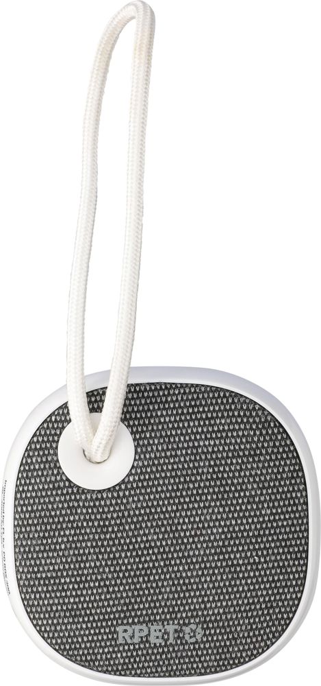 Recycled ABS and rPET fabric wireless speaker with small nylon carrying cord. Battery capacity 300 mAh with 3W output, wireless technology version 5.3, and 10-meter operating range. Charging time approximately 2 hours, with a playback time of 2–3 hours. Includes 30 cm white USB-C charging cable. Features rPET logo on the fabric and recycled ABS logo on the side. Individually packaged in a brown cardboard box.