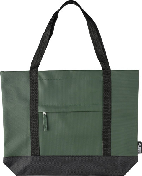 rPET (600D) polyester tote bag with PU coating on both sides for water repellency. Features a front zippered compartment, a small zippered pocket inside, and long carrying handles. Designed with a 10-litre capacity and a 10 kg carrying capacity. Includes an rPET label.