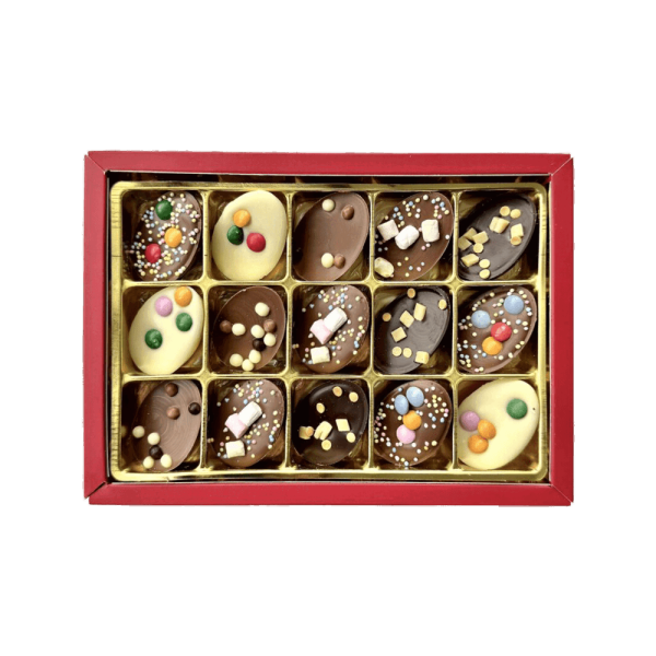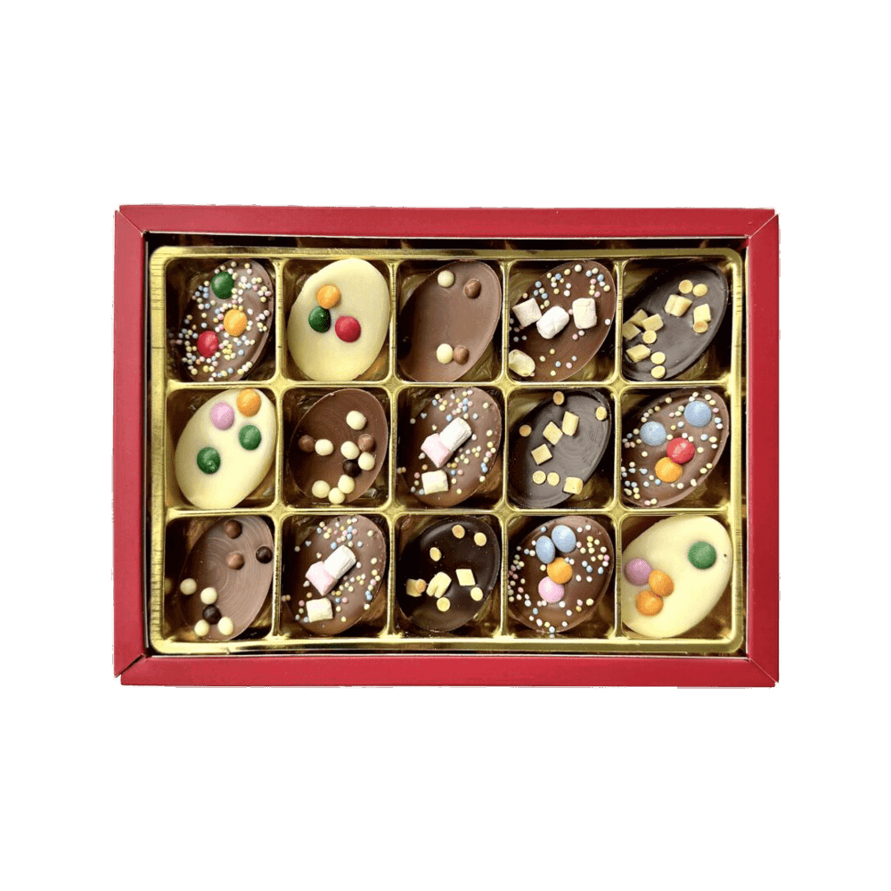 Half, solid Easter eggs topped with a decorative finish — fun and delicious. What an Easter gift. A topping in fresh spring colours: mini smarties, caramel pieces or mini marshmallows. The eggs are made from milk, white and dark chocolate.