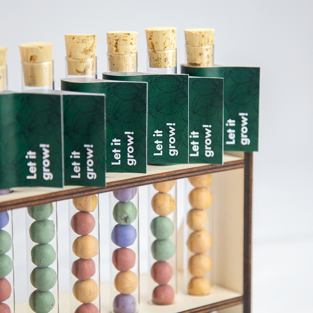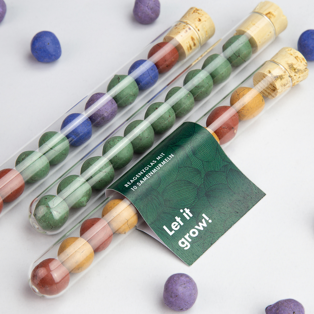 An eye-catching eco-gift: German-made glass tube filled with 10 colorful or plain seed balls made of soil, clay and a rich blend of 19 flower species. Non-toxic and kid-safe. Customizable paper tag around the tube – perfect for green branding