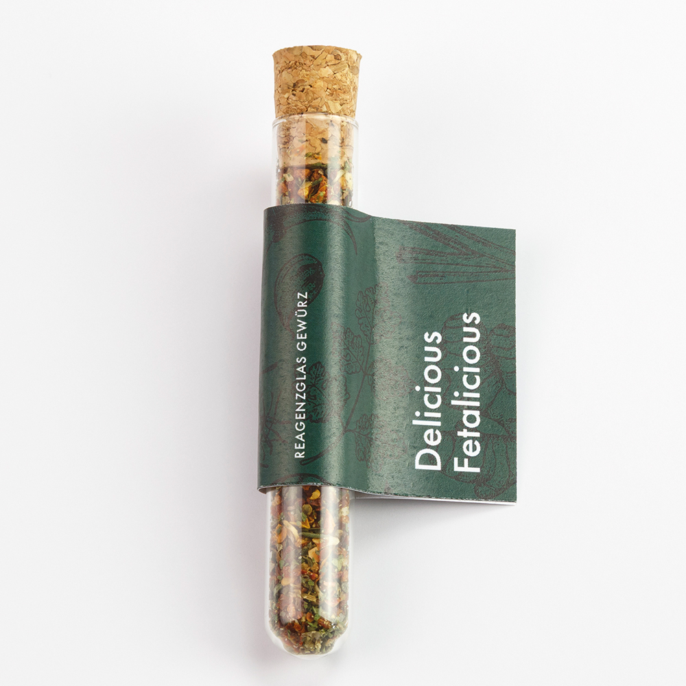 The “Spice Mix in a Test Tube” combines flavor and style in a compact format. Choose from ten delicious spice blends, elegantly filled into real glass test tubes. Each tube is customized with your label design. Optionally, include a creative “Yummy Card” with matching recipe ideas. Made in Germany, the tubes offer a charming and sustainable alternative to traditional spice jars – a tasteful promotional gift that stands out and delights.