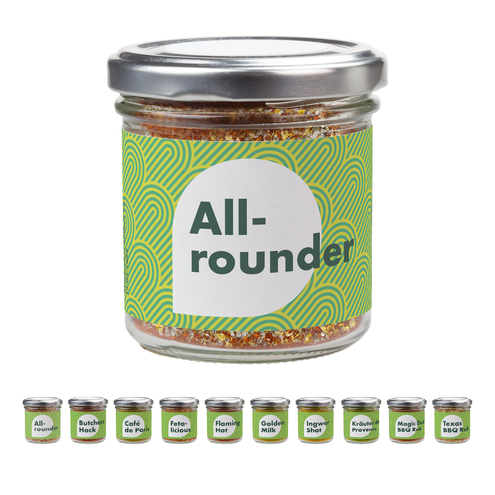 Midi screw-top jar with a fine blend of spices (10 different spices) of your choice, with individual labeling in your corporate design. With matching ReUse lid for an extra charge. Contents: approx 60 g spice mixture.