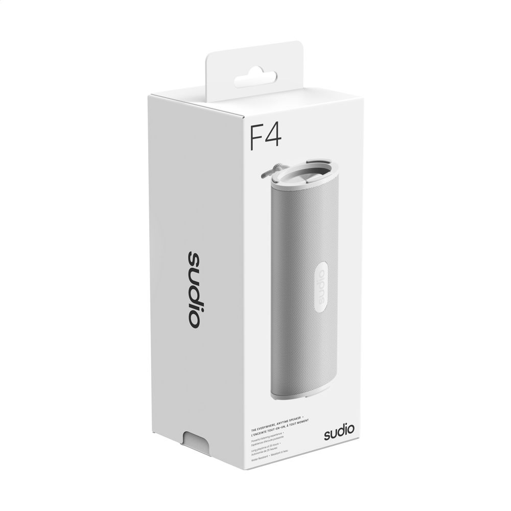 Sudio F4 is a portable 20W speaker, designed to complement your space. It's slim, has a perforated-metal body and smooth silicone details. It has a rich, immersive sound. The 25-hour battery life ensures effortless listening whether at home or on the move. Powerful listening experience, water resistant and a stable Bluetooth 5.4 connection for up to 10 metres. Made from recycled plastics. A sustainable choice that doesn't compromise on style or sound. In a plastic-free packaging that uses FSC-certified paper and soy ink. Includes USB-C charging cable and user manual. Swedish design, music to your ears. Each piece in a luxury gift box.