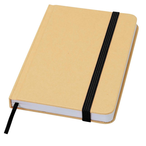 The Reed A6 recycled cardboard hard cover notebook with rounded corners is not only an office essential but also a great opportunity to promote your brand. The notebook has 96 blank sheets of 70 g/m2 paper and a soft-feel cover. Comes with an elastic closure and a ribbon marker.