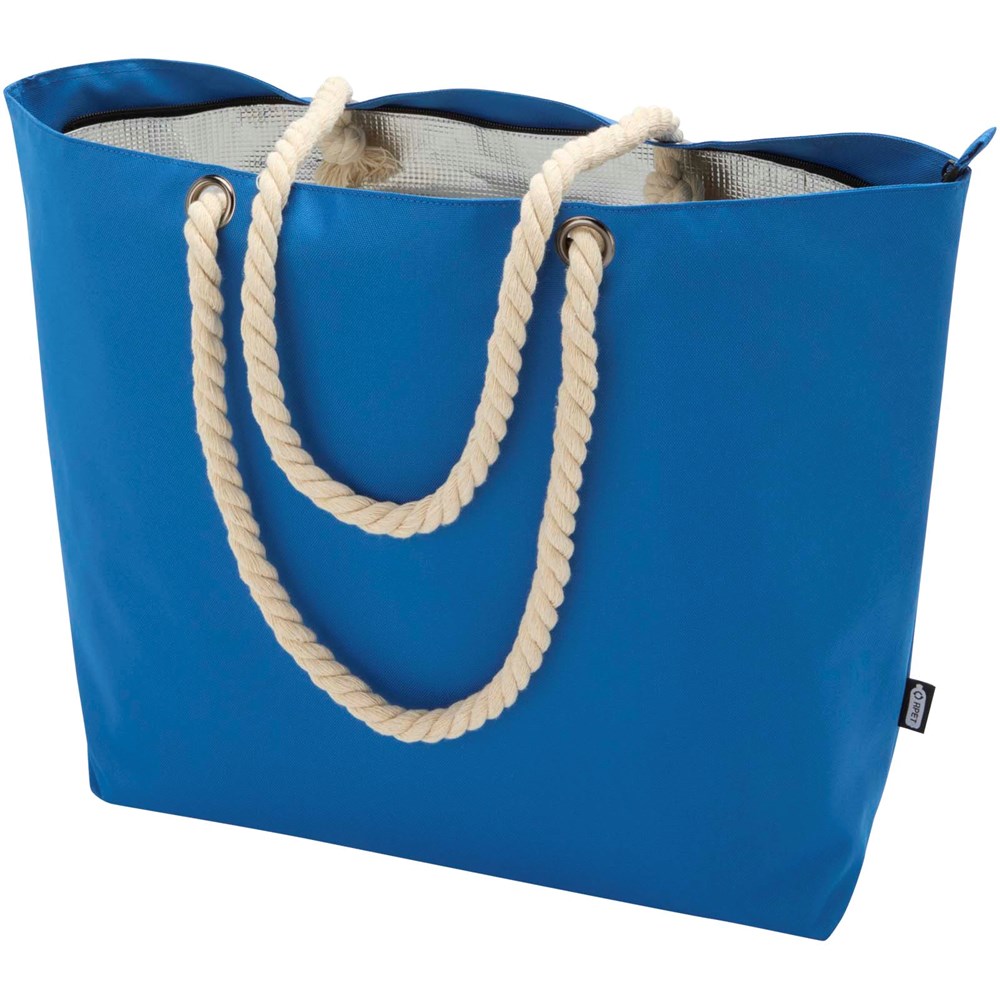 The Panama cooler tote bag is made from GRS certified recycled polyester, and features a large zipped main compartment, and high-quality aluminium foil and cotton cord handles. Suitable for various activities such as grocery shopping or for a day at the beach or in the park. Volume capacity: 23 litres. Resistance up to 10 kg weight. PVC free.