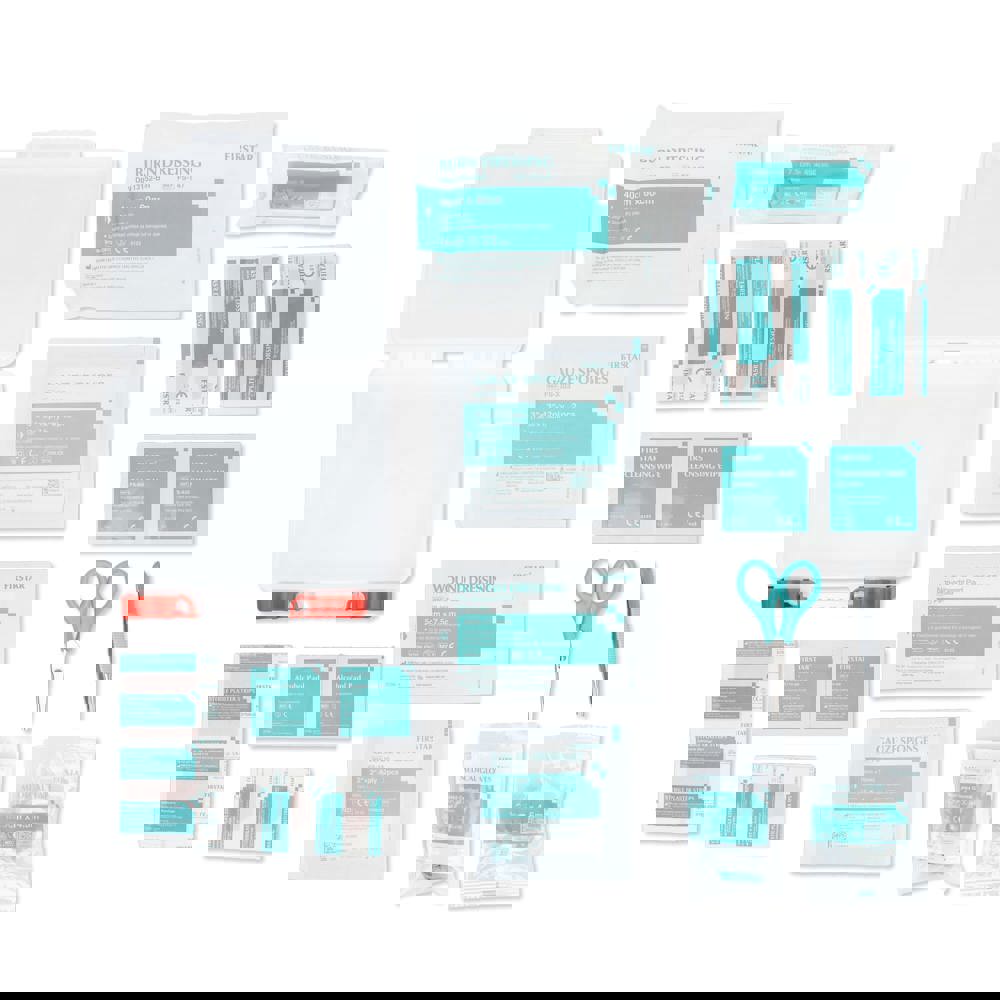 Comprehensive first aid kit in a durable PP case, compliant with European standards. Designed for home, office, travel, or outdoor use. Offers a wide range of items for wound care, burns, and minor injuries. Contents: 1 × gauze sponges 3" × 3" 12 ply (2pcs/pack), 1 × burn dressing 40 × 60 cm, 2 × non-adherent pads 5 × 7.5 cm, 2 × gauze sponges 2" × 2" 8 ply (2pcs/pack), 1 × elastic bandage 7.5 × 450 cm, 1 × scissors, 1 × tweezers, 1 × medical tape 1.25 cm × 4.5 m, 1 × medical gloves (2pcs), 2 × cleansing wipes, 4 × alcohol pads, 5 × adhesive plasters 72 × 19 mm, 5 × adhesive plasters 38 × 38 mm, 5 × adhesive plasters 22 mm dia., 5 × adhesive plasters 76 × 38 mm.