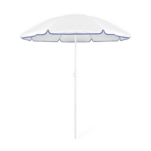 Beach umbrella of 8 panels in resistant nylon and in a varied range of bright tones. 150cm in diameter, with side skirts with piping and metal coated tubes in white color. Adjustable in height and presented in a PVC sleeve with shoulder strap.