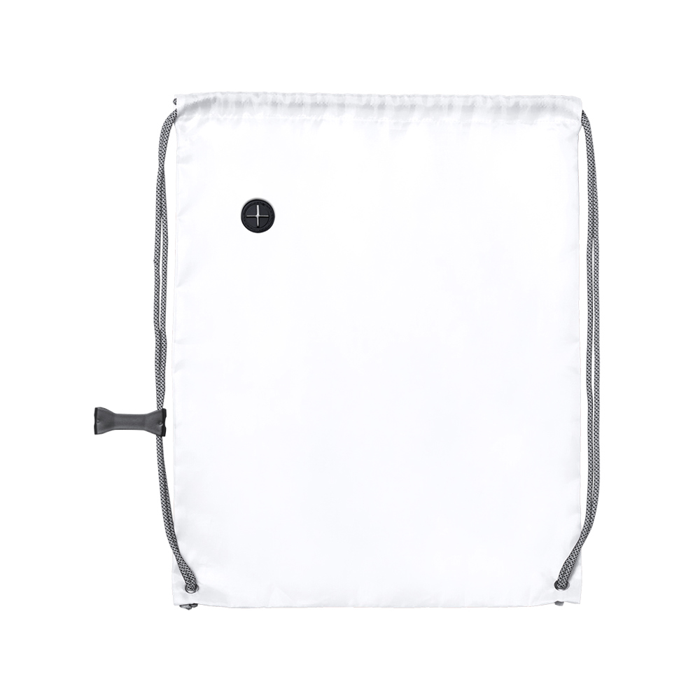 Drawstring backpack in soft polyester 190T in bright tones. With headphones outlet, with extra thick, grey color, self closing strings. With adjustment accessory and corners with metal eyelets and reinforcement.