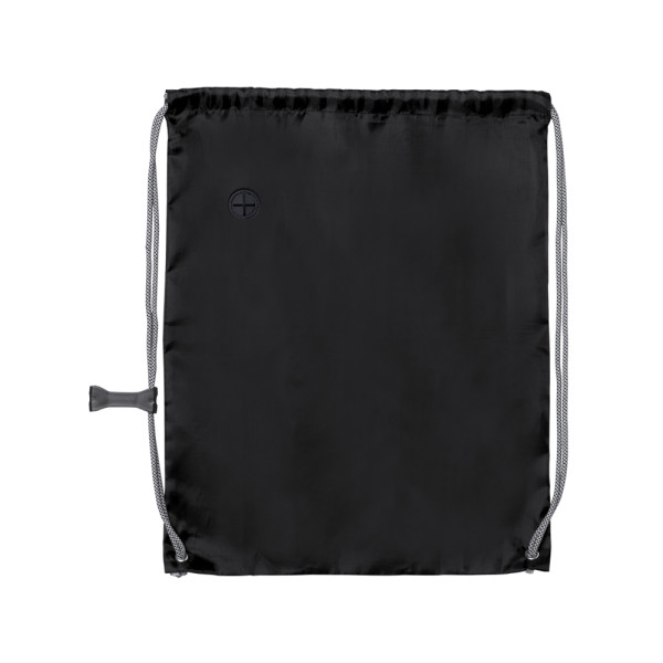 Drawstring backpack in soft polyester 190T in bright tones. With headphones outlet, with extra thick, grey color, self closing strings. With adjustment accessory and corners with metal eyelets and reinforcement.