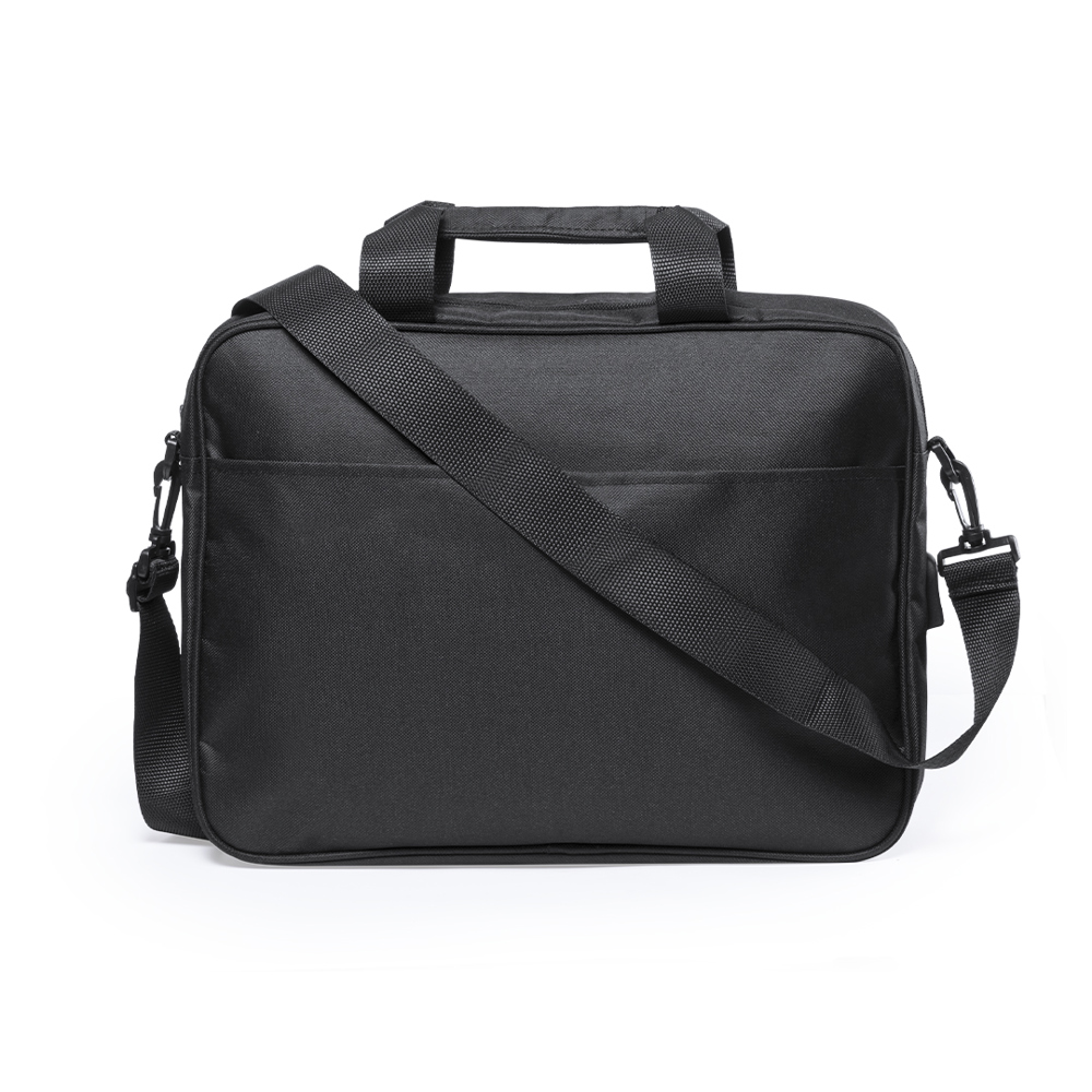 Document bag in resistant 600D polyester with black finish and zipper closure. With headphone outlet and inside compartment with USB port for powerbank connection (not included). With resistant reinforced handles and accessory at the rear for trolley bar adjustment. Inside with padded compartment for laptops up to 15 inches and compartment for tablets up to 10 inches. With a wide range of inside and outside pockets and adjustable shoulder strap with carabiner closure.