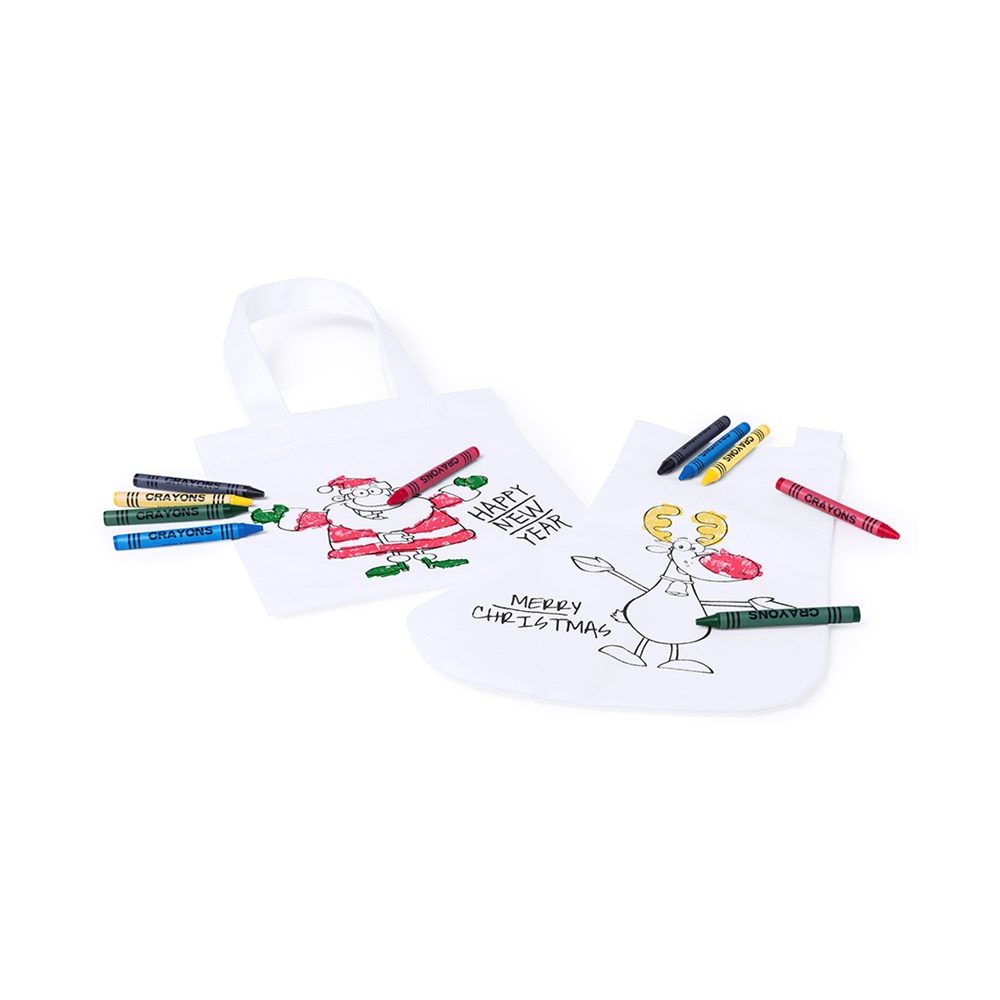 Non-woven sock in white color especially designed to be colored with crayons. Includes 5 cylindrical body crayons in varied colors. With hanging strap and heat-sealed finish.