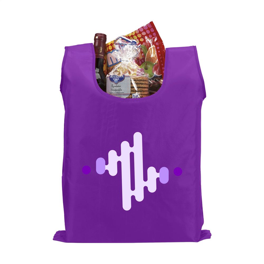 Foldable shopping bag made from 190T polyester. With pouch with a press stud and carabiner. The bag is delivered unfolded with a separate pouch. Meas. folded 6 x 2,5 x 12,5 cm. Capacity approx. 8 litres.