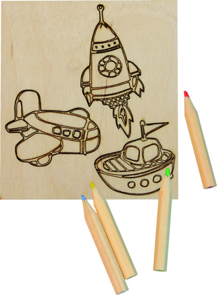 Colour in as you wish. Three motifs laser-cut onto a 3 mm birch plywood board (natural finish), which can also be broken out. Includes a four-piece coloured pencil set. Packaged in a paper bag.
