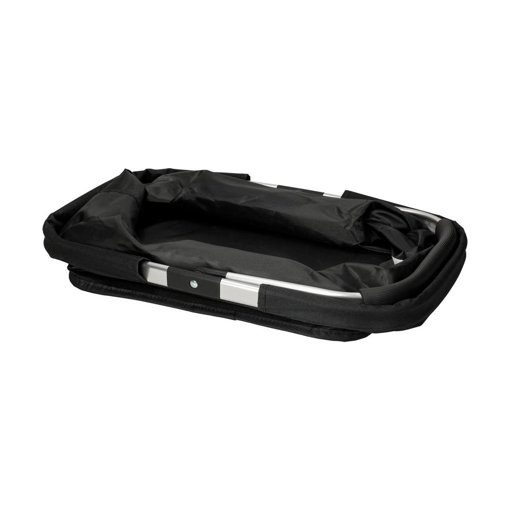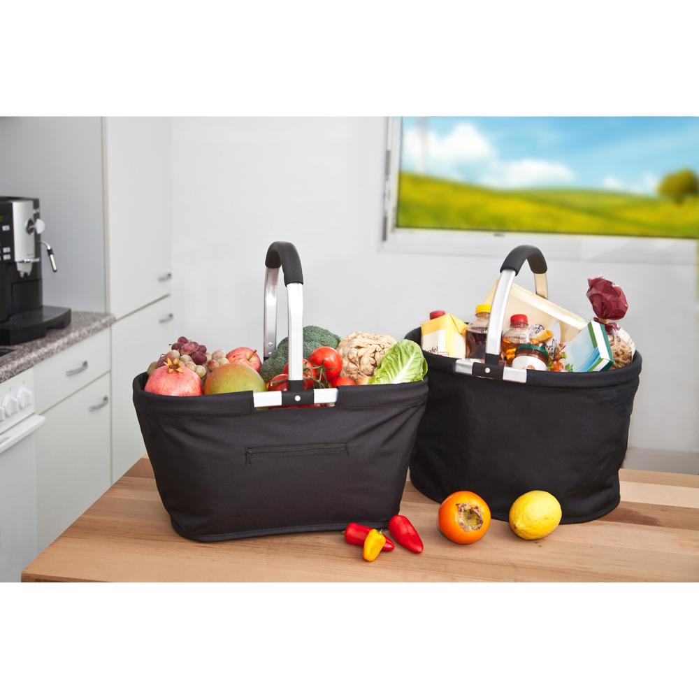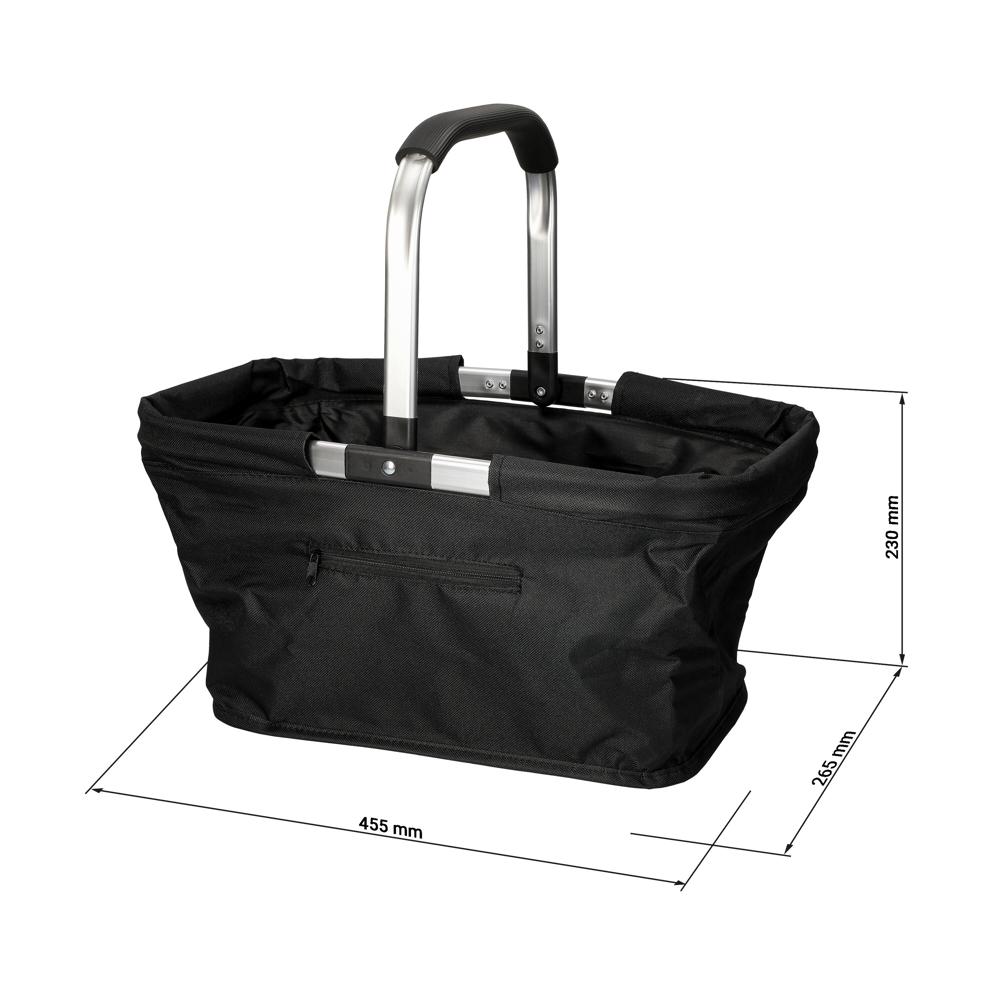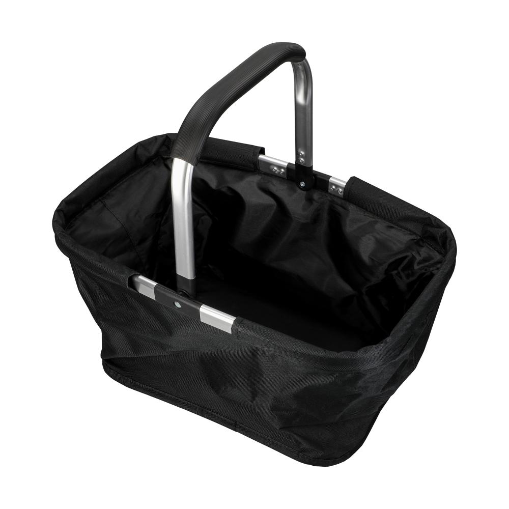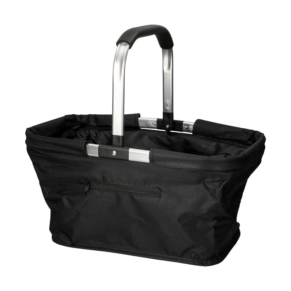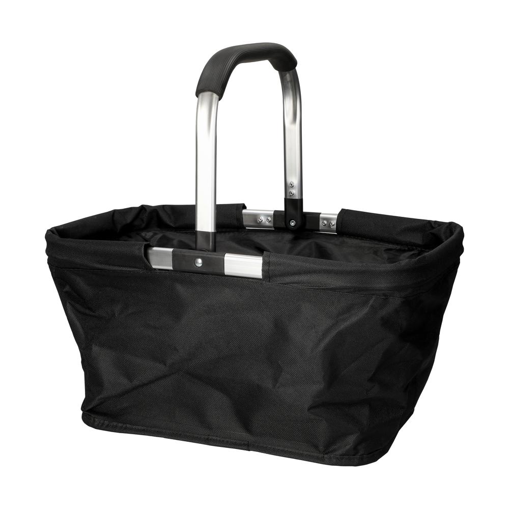 In this way, shopping is fun. Spacious, rectangular shopping basket featuring a light and stable aluminum frame, continuously sewn with double-layered polyester. The foldable handle is coated with soft EVA for comfortable carrying.
