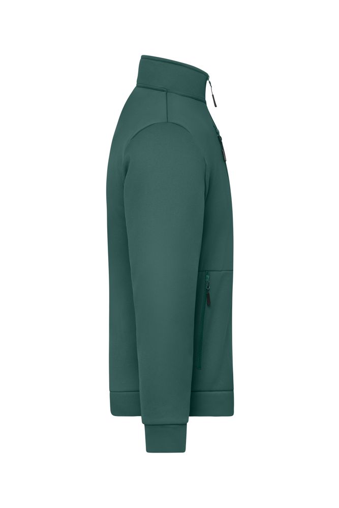 Soft, elastic material with smooth exterior and fleece inside The material contains 21% Sorona Attached, elastic waistband and cuffs 2 side zip pockets 1 zipped breast pocket Zips: YKK 1/2 chest: 50 cm length from shoulder: 68 cm sleeve length: 64 cm OEKO-TEX® Standard 100 (15.0.70467) stand-up collar YKK-Zipper