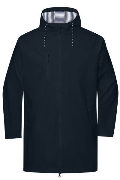 Windproof and waterproof elastic material (3,000 mm water column) Printed stripe on the inside of the material and contrasting details Seams are sealed and all zips are waterproof Adjustable hood with drawstring Extended back Underarm ventilation with eyelets Press studs for width adjustment on the sleeves Full-length under-panel 2-way zip with chin guard 2 side pockets and one breast pocket with zips Zips: YKK 1/2 chest: 51 cm 1/2 waist width: 50 cm 1/2 bottom width: 52 cm front length from shoulder: 90 cm length back from shoulder: 94 cm sleevelength raglan: 74,50 cm Water column from 1.500 mm Water column from 2.000 mm Water column from 3.000 mm Taped seams Waterproof Zipper 2-way zip fastener YKK-Zipper