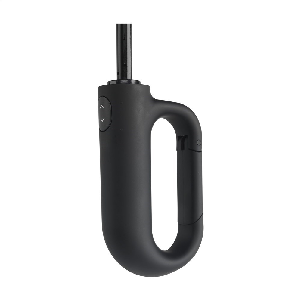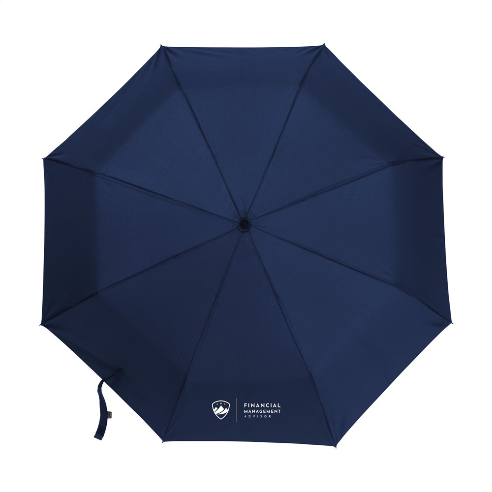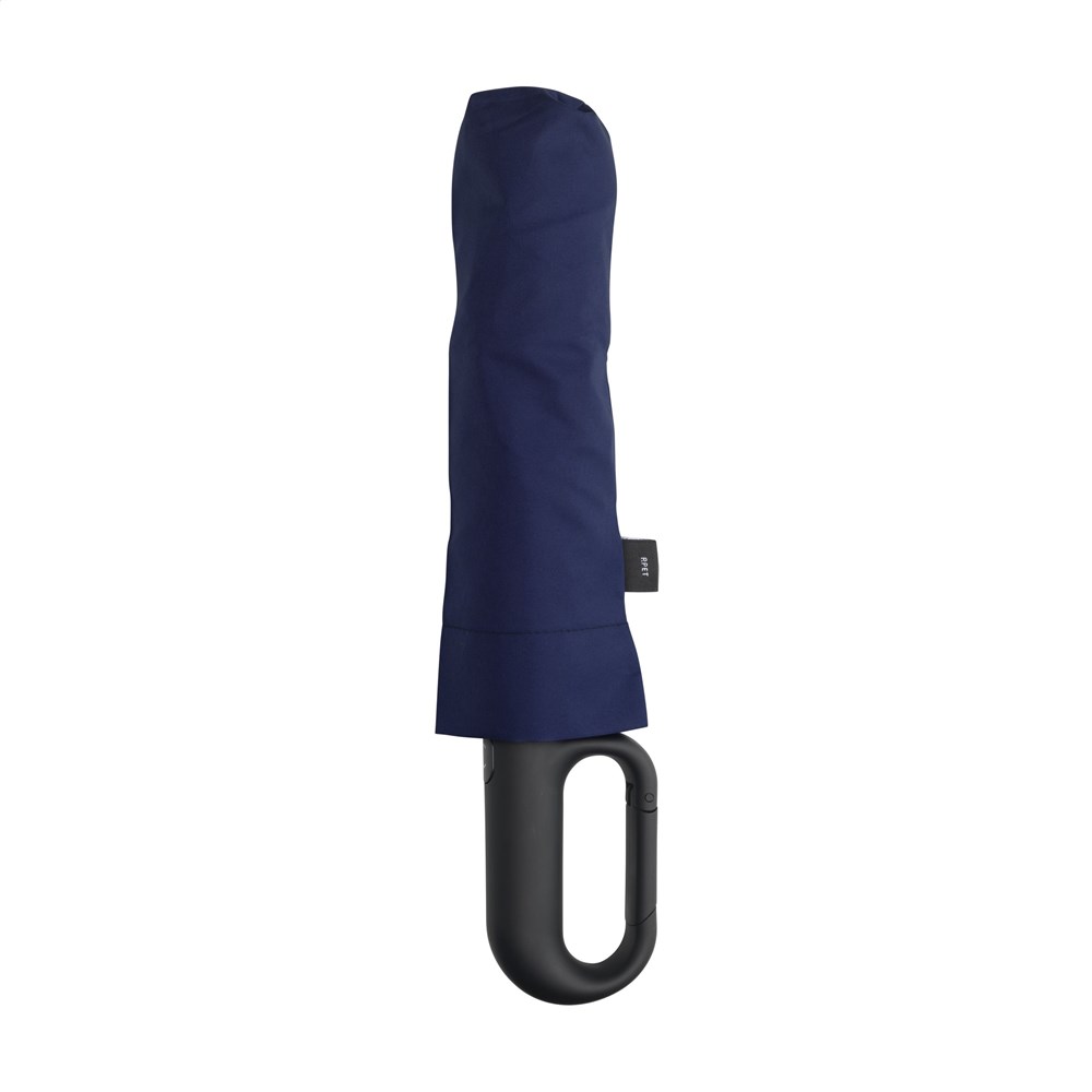 Fully automatic folding and unfolding umbrella with 190T RPET pongee polyester canopy and a comfortable plastic handle in the shape of a carabiner. This makes it easy to hang the umbrella on, for example, a backpack. With a canopy diameter of 97 cm, metal shaft, fiberglass frame, Velcro closure and storage bag. Dim. when folded: 7 x 6 x 33 cm. RCS certified. Total recycled material: 15%.