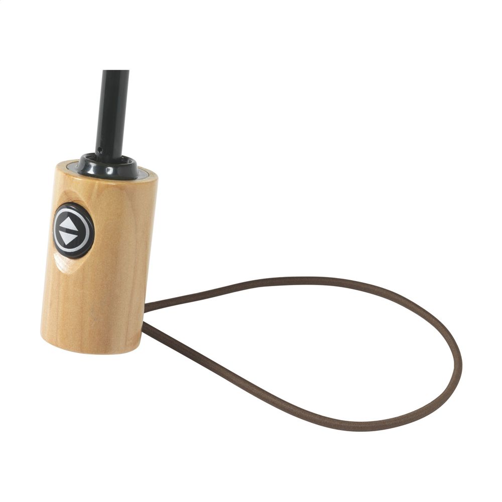 Folding umbrella with automatic opening and closing mechanism. Supplied with an RPET 190T pongee polyester cover. This umbrella also has a stainless-steel shaft and frame wooden handle, elastic carrying loop and Velcro closure. Dim. when folded: Ø 6 x 28,5 cm. RCS-certified. Total recycled material: 16%.