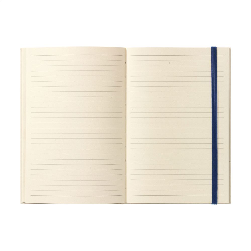 Exclusive A5 notebook made from the recycled waste of the sugar cane plant. With hard cover, 80 sheets/160 pages of lined paper (100 g/m²) and an elastic closure. The cover and paper are FSC® certified. The paper, in which small fibres are visible, has a beautiful light brown colour. This emphasises the use of natural materials. After harvesting, the roots of the sugar cane plant remain in the ground. The stems and leaves are processed into a residue that is used to make bio-plastic. A sugarcane plant extracts CO2 from the air during growth and can live for up to 10 years.