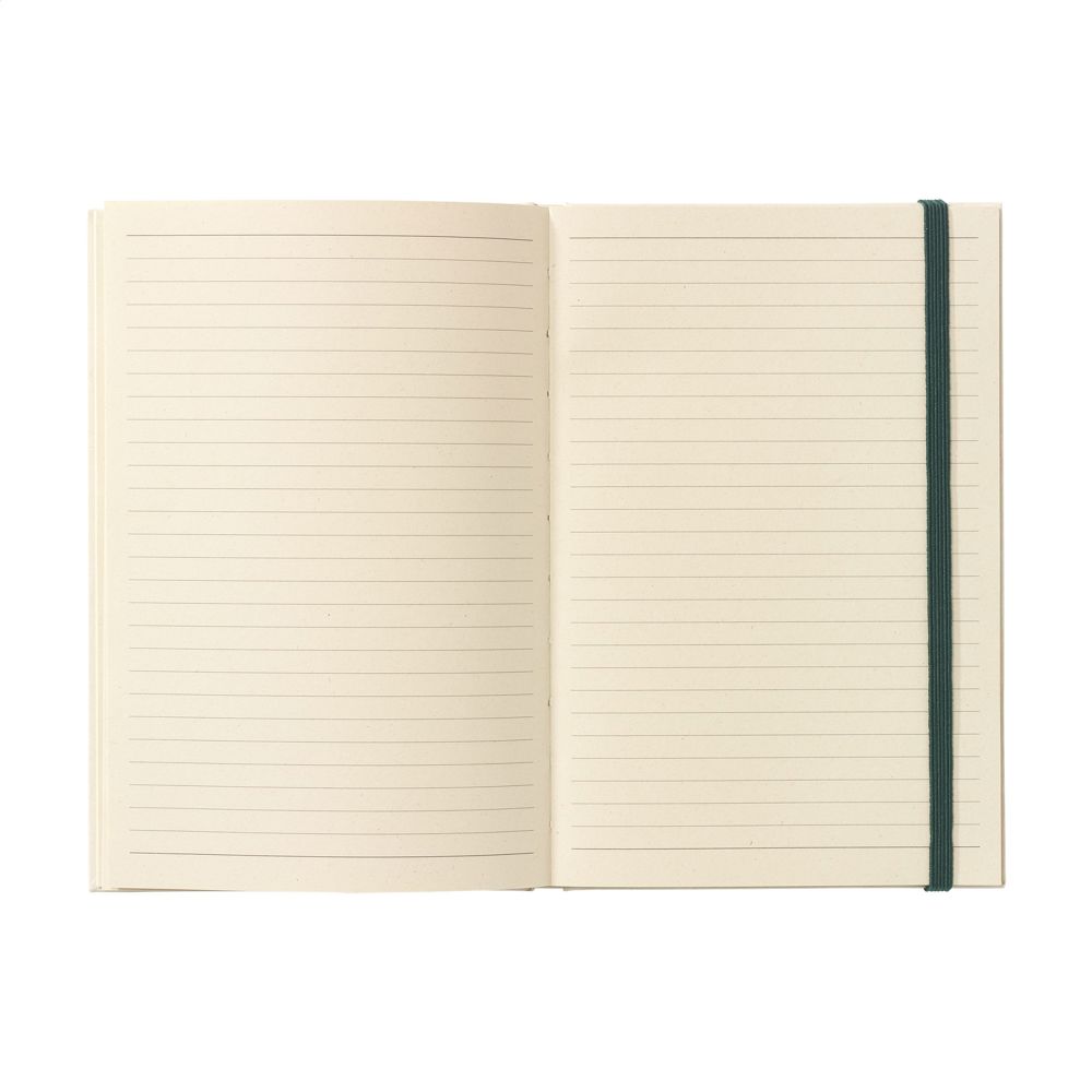 Exclusive A5 notebook made from the recycled waste of the sugar cane plant. With hard cover, 80 sheets/160 pages of lined paper (100 g/m²) and an elastic closure. The cover and paper are FSC® certified. The paper, in which small fibres are visible, has a beautiful light brown colour. This emphasises the use of natural materials. After harvesting, the roots of the sugar cane plant remain in the ground. The stems and leaves are processed into a residue that is used to make bio-plastic. A sugarcane plant extracts CO2 from the air during growth and can live for up to 10 years.