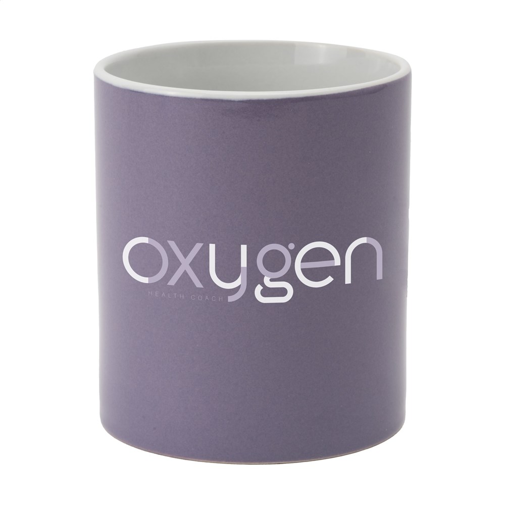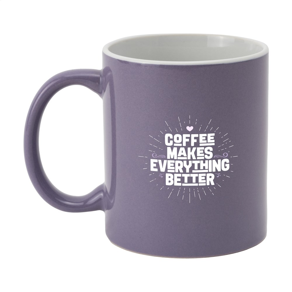 High quality ceramic mug. In all white or with a coloured exterior. Dishwasher safe. The imprint is dishwasher tested and certified: EN 12875-2. Capacity 350 ml.