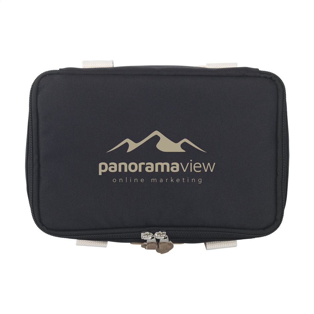 This stylish generous cooler bag from the Wooosh brand. The outer fabric is made from 100% RPET 600D polyester. With a handy front zip pocket for storing a phone, ID or wallet. The attractive accents, such as the luxurious zip pulls and the soft, woven carrying straps, catch the eye immediately. Thanks to the insulating layer, drinks and food stay perfectly at temperature. Ideal for a relaxing picnic, a day at the beach or for travelling. GRS-certified. Capacity approx. 9 litres.
