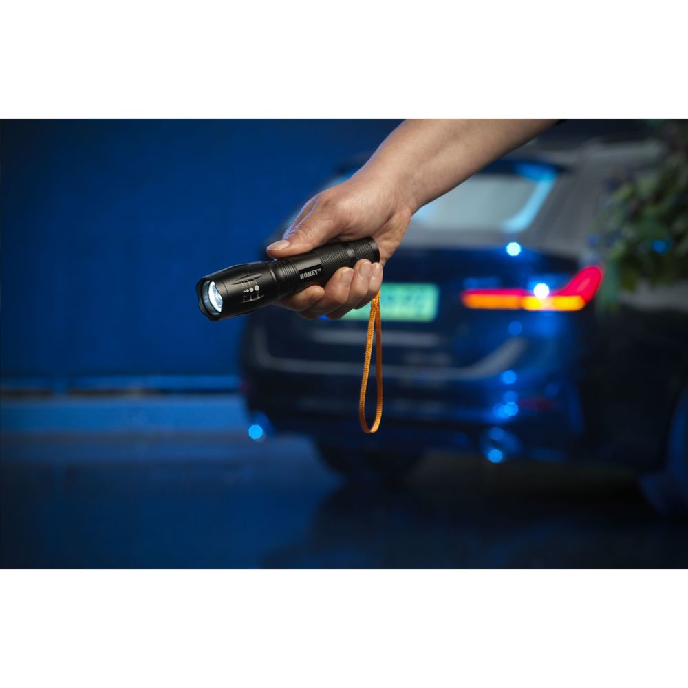 Compact, lightweight aluminum flashlight from Homey's. With T6 LED (200 lumens). This versatile lamp has a flashlight, SOS function and zoom function in three settings. Zoom in for a concentrated beam of light on specific areas, or zoom out for a wider lighting range. Maximum operating time 3.5 hours. Range 150 meters. Water resistant (IP55). Suitable for the handyman, outdoor activities and emergencies. Including wrist strap and batteries. Packed individually.