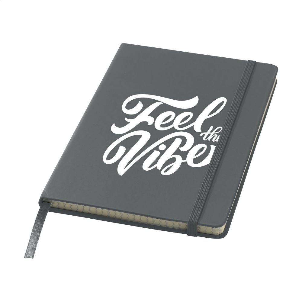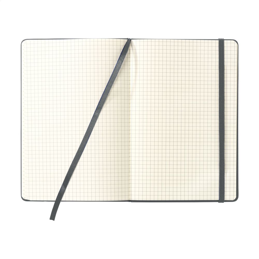 Notebook in A5 format with approx. 96 sheets/192 pages of cream coloured, FSC Mix certified squared paper (70 gr/m²). With bound spine, hard cover, elastic fastener and polyester ribbon. The squared paper (5 x 5 mm) is ideal for calculations, drawing graphs and designs, and organising information.