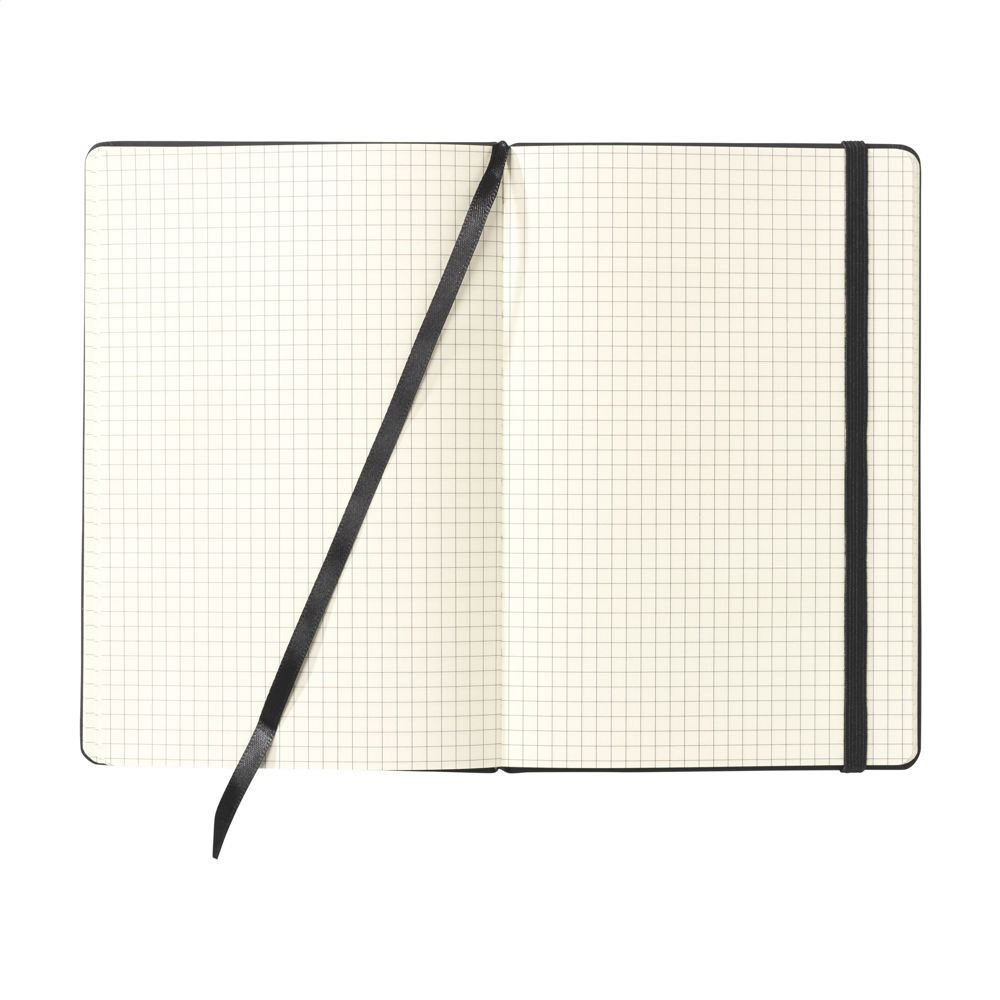 Notebook in A5 format with approx. 96 sheets/192 pages of cream coloured, FSC Mix certified squared paper (70 gr/m²). With bound spine, hard cover, elastic fastener and polyester ribbon. The squared paper (5 x 5 mm) is ideal for calculations, drawing graphs and designs, and organising information.